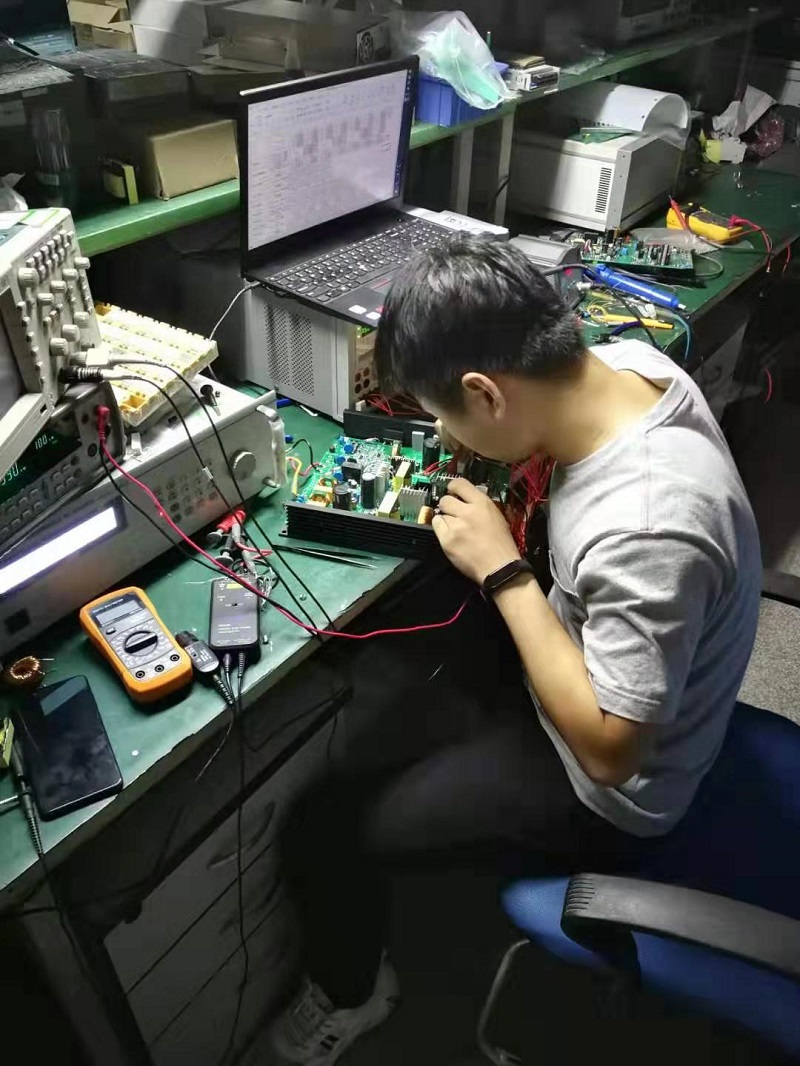 7月29日晚9:20,十樓工業品實驗室。工業品技術部王磊為趕某項目的定制電源,同時給某一跨國項目爭取時間,在獨自加班調試電源。