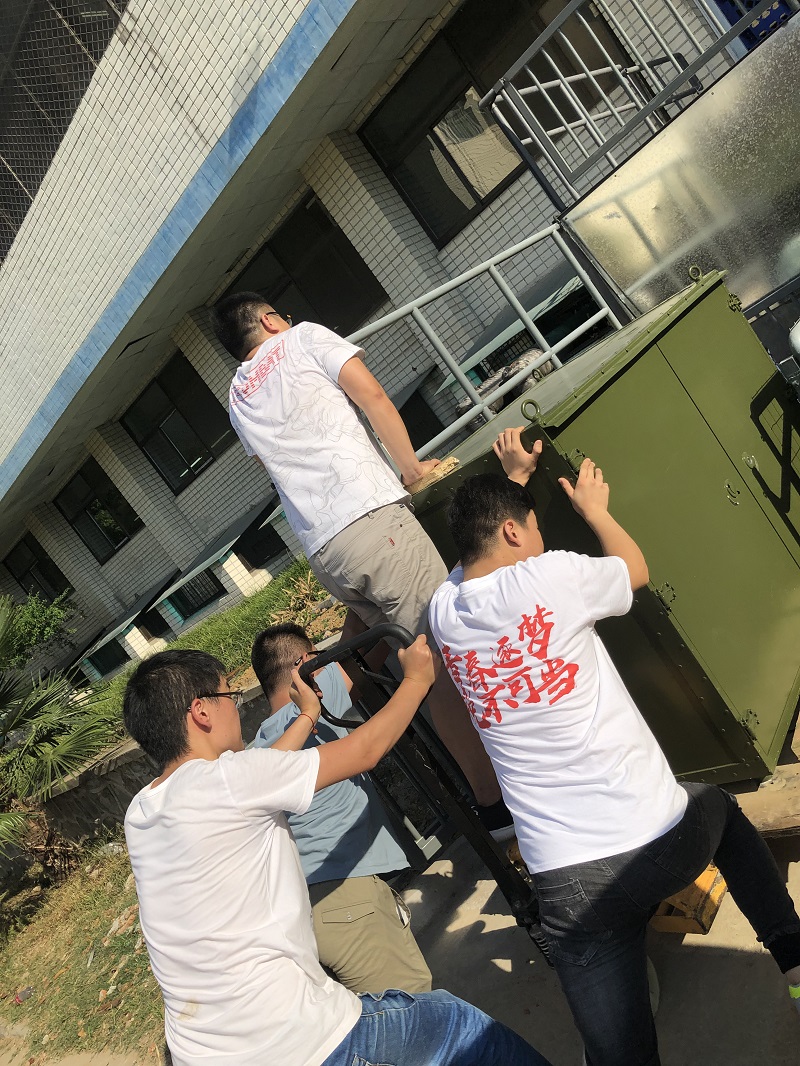 7月29下午,在101一樓西邊。系統電源事業部沈正林、劉夢超、吳剛、崔浩杰等在高達38℃的室外,進行機柜的運輸作業,在烈陽下暴曬1個多小時,他們汗如雨下。