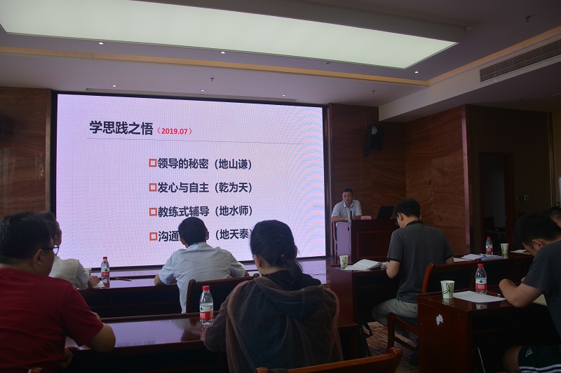 在講解中,胡書記不僅嫻熟運用我國傳統經典《易經》的卦理、卦象闡述“領導”和“管理”中對人、對事、對問題的思考,也通過西方心理學、管理學研究成果講解了輔導、溝通的意義、方法和工具。最后以清朝儒將左宗棠在無錫梅園所題“發上等愿,結中等緣,享下等福;擇高處立,尋平處住,向寬處行。”的詩句勉勵大家主動改變,學習領導和管理的方法并加以實踐,做一個正直善良而又富有人格魅力的領導者。