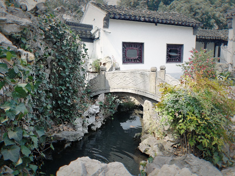 這是一個江南園林的隅落,行到此處,空靜寧謐,青瓦白墻,古橋流水,幾株孕育待放的茶花,密密層層的爬山虎讓假山石春意勃發(fā),動靜之中傾訴著流連前世、古往今朝。坐在石墩上,掬一捧池水,映出滿心歡喜。隅之靜處,心之安處,只愿時光凝固,你我不負(fù)。