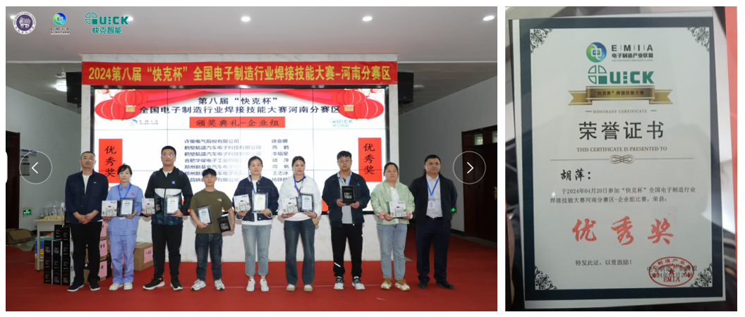 為弘揚(yáng)勞動(dòng)精神、工匠精神,進(jìn)一步提高焊接員工的榮譽(yù)感和敬業(yè)精神,樹立行業(yè)榜樣。華耀電子制造中心分別選派優(yōu)秀技能人員及工藝人員參加了由電子制造產(chǎn)業(yè)聯(lián)盟舉辦的第八屆“快克杯”全國(guó)電子制造行業(yè)焊接技能大賽(河南分賽區(qū))和第二屆“海承杯”全國(guó)電子制造行業(yè)線束線纜制作工藝與操作技能大賽(東部賽區(qū)),均斬獲佳績(jī)。