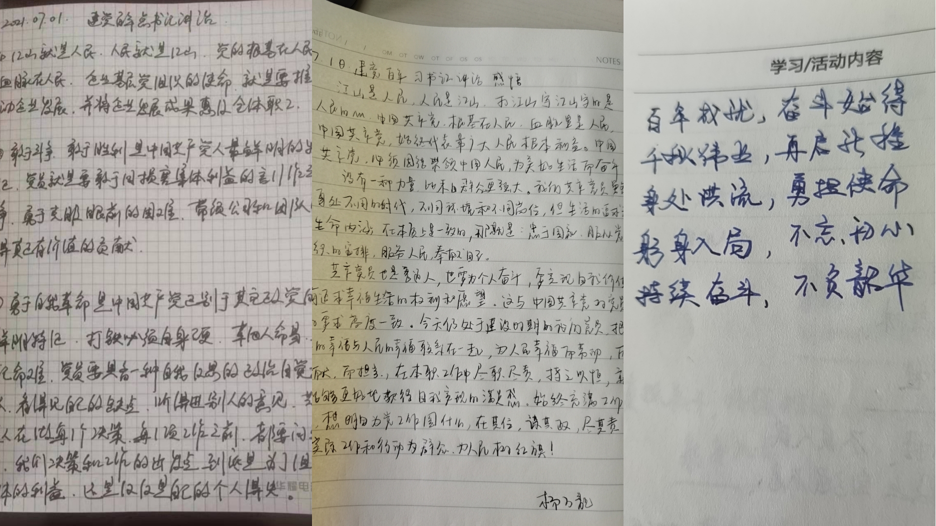 黨員許瑋瑋:聽了總書記在建黨百年慶祝大會上的講話,字字走心,句句在理,樸素的道理,堅定的信念,讓我們在思想上與黨走的更近。作為一名黨員,聽完報告后,我的心更靜,我的血更熱,目標更明確……未來,我們要在黨的領導下,勇于面對一切風險挑戰,敢于斗爭,善于斗爭,逢山開路,遇水架橋,永遠跟黨走,堅持黨的領導,以史為鑒,開創未來,為黨的下一個百年目標奮斗!