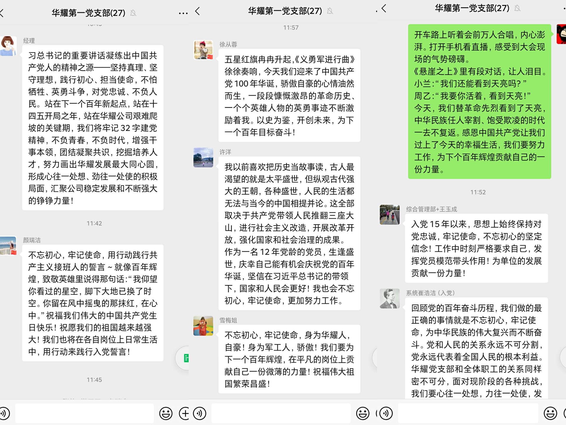 2021年7月1日上午8時,華耀公司黨總支以多種形式組織全體黨員收看了慶祝中國共產黨成立100周年大會盛況直播,聆聽總書記重要講話。黨員同志紛紛分享了學習心得,表達了對中國共產黨的熱愛和對未來工作生活的信心。